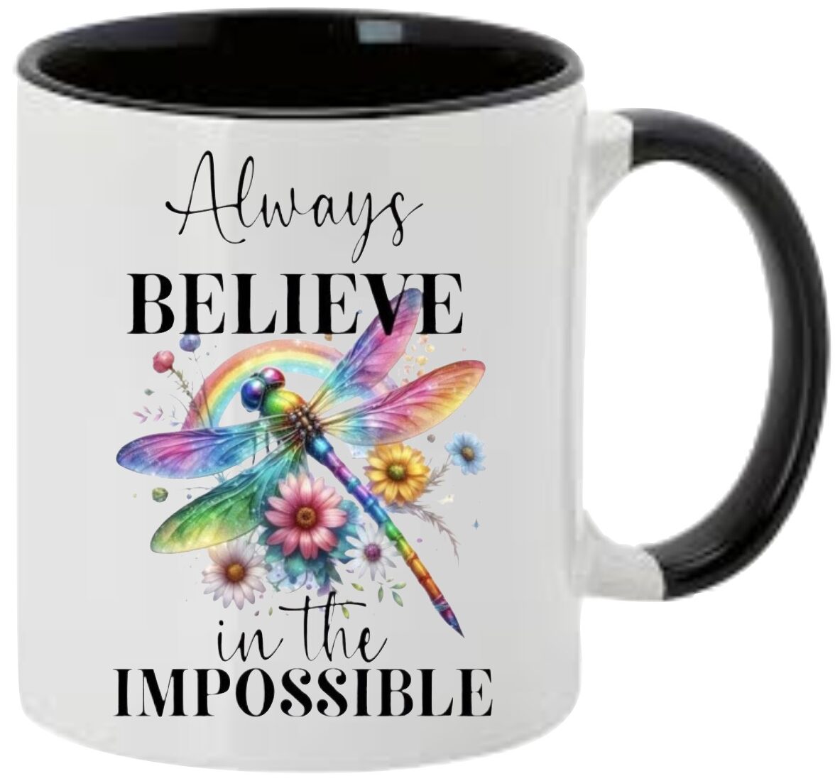 Black handle white mug with Always Believe in the Impossible design printed onto mug