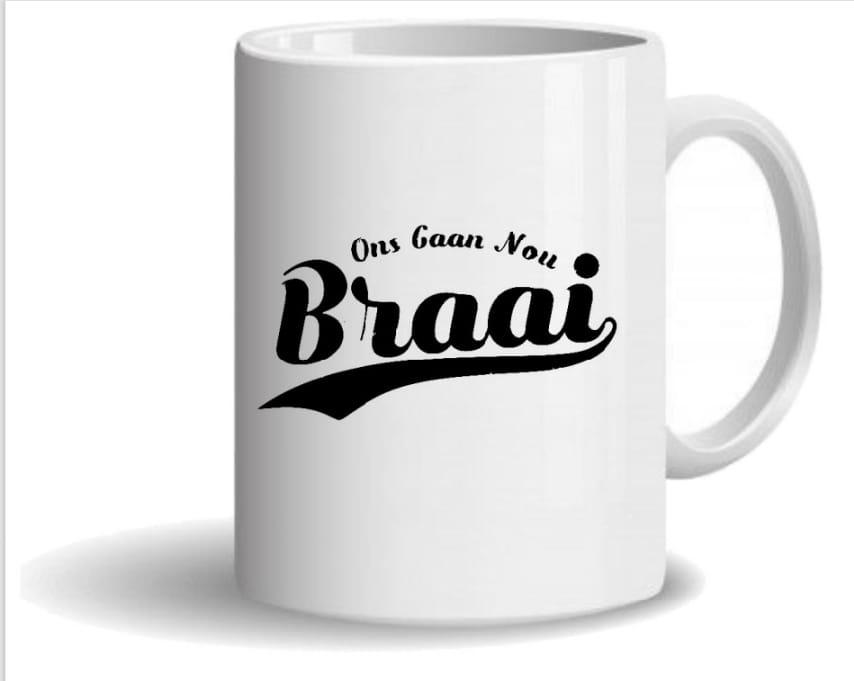 Standard white mug with Nou Gaan Ons Braai design printed onto mug