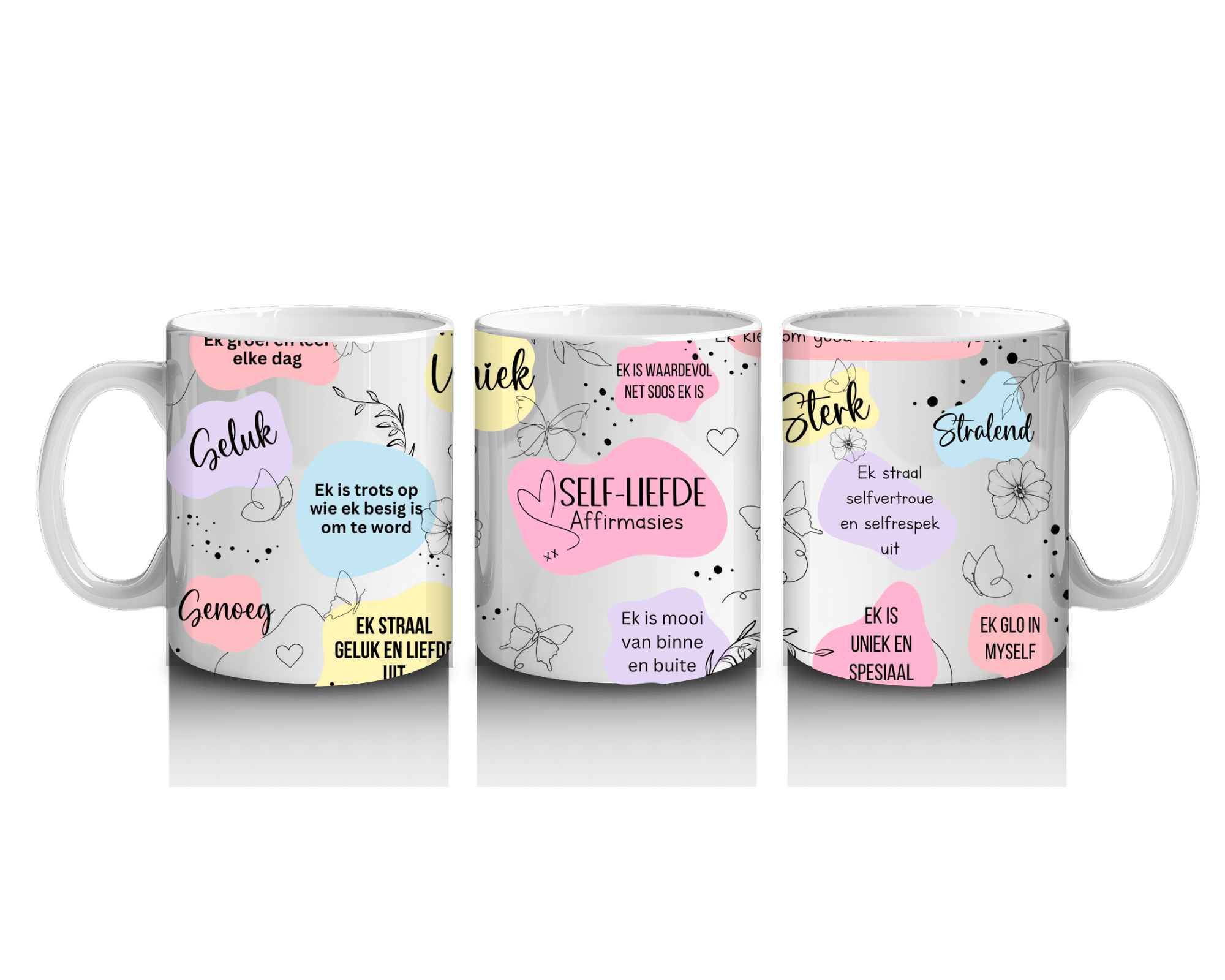 Standard white mug with Self Liefde Affirmations printed onto mug
