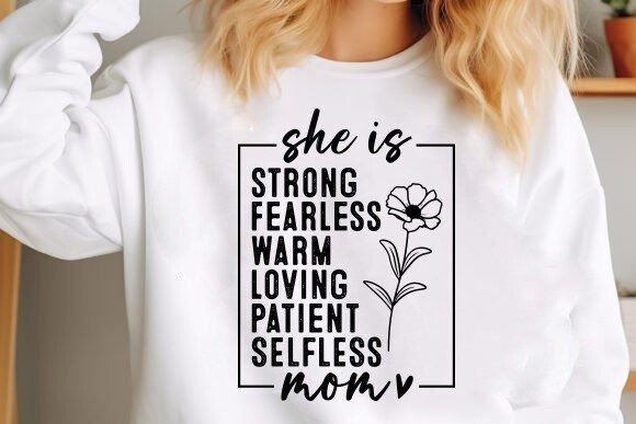 White Sweater with She is (Strong, Fearless, Warm, Loving, Patient, Selfless) Mom print on front in Black