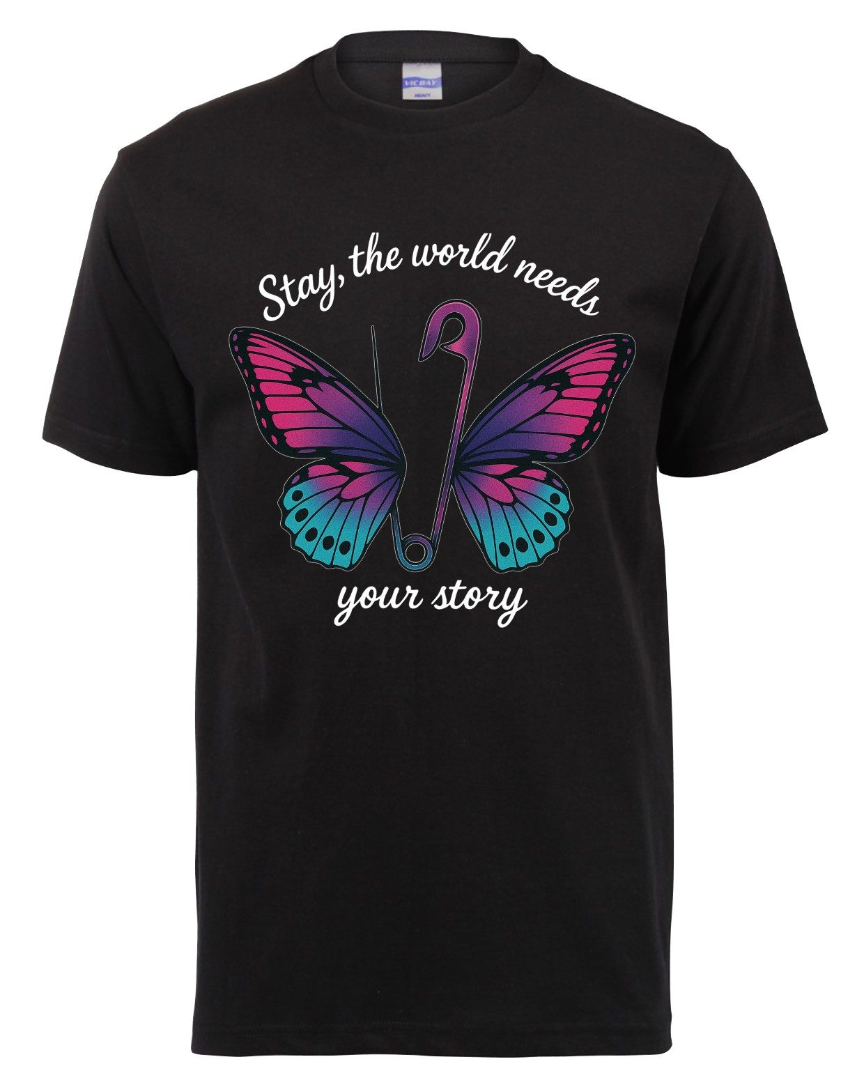 165g Black T-shirt with Stay the World Needs Your Story design printed on front