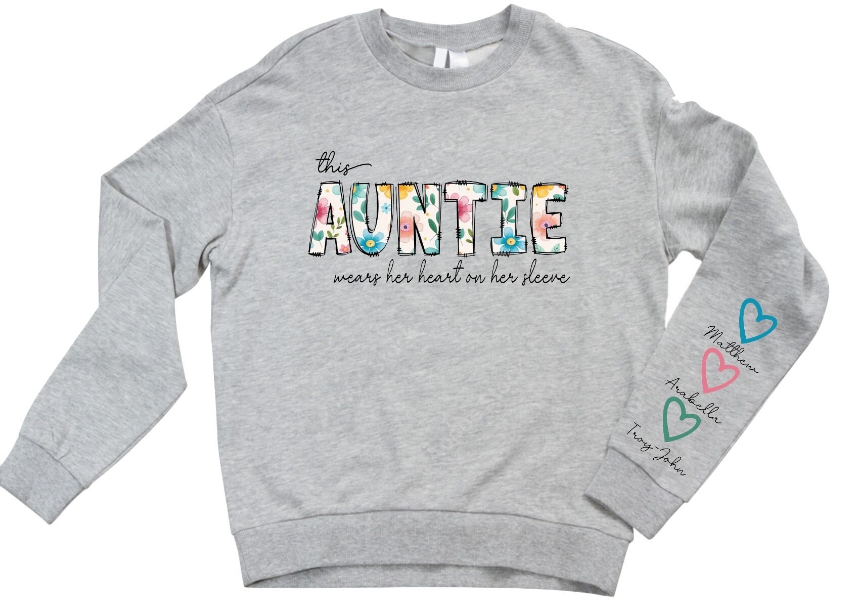 Grey Sweater with This Auntie wears her heart on her sleeve in front and hearts with personalised names onto right sleeve