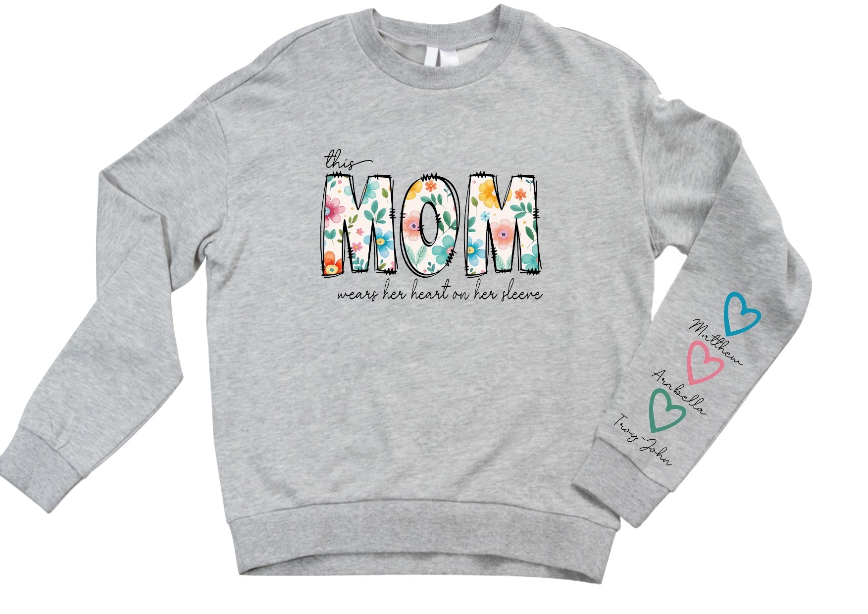 Grey Sweater with This Mom wears her heart on her sleeve in front and hearts with personalised names onto right sleeve