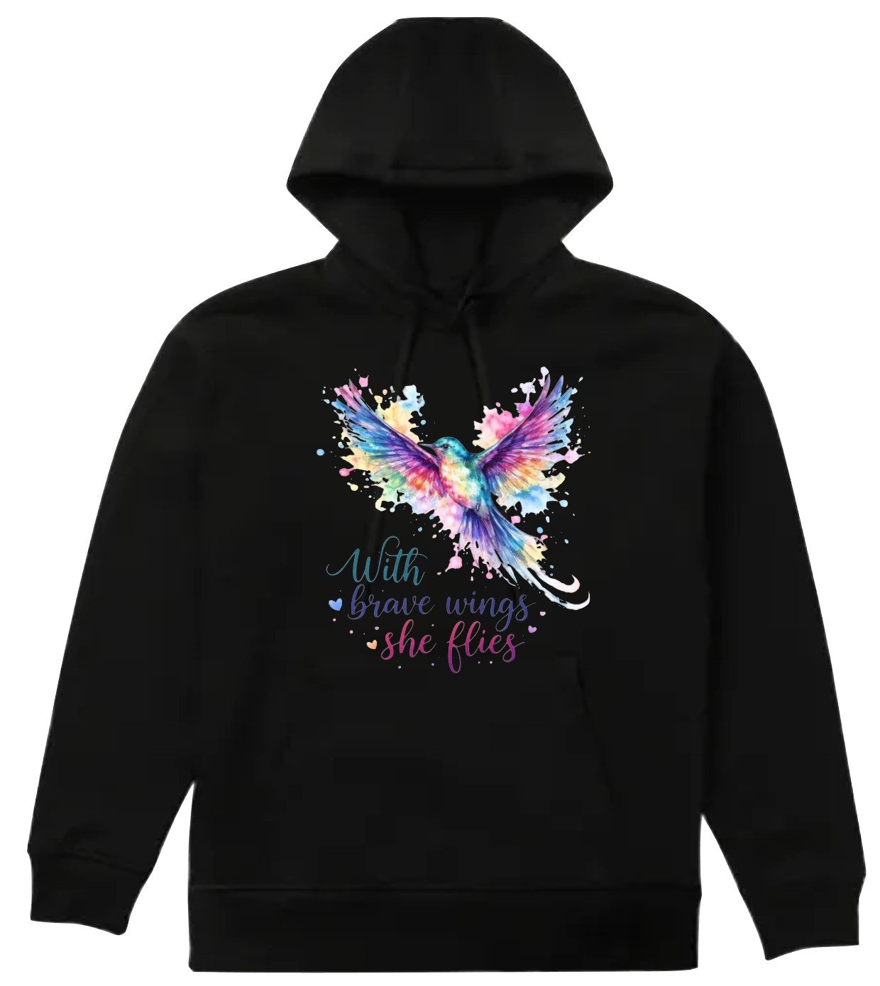 Black Hoodie with With Brave Wings She Flies design printed on the front