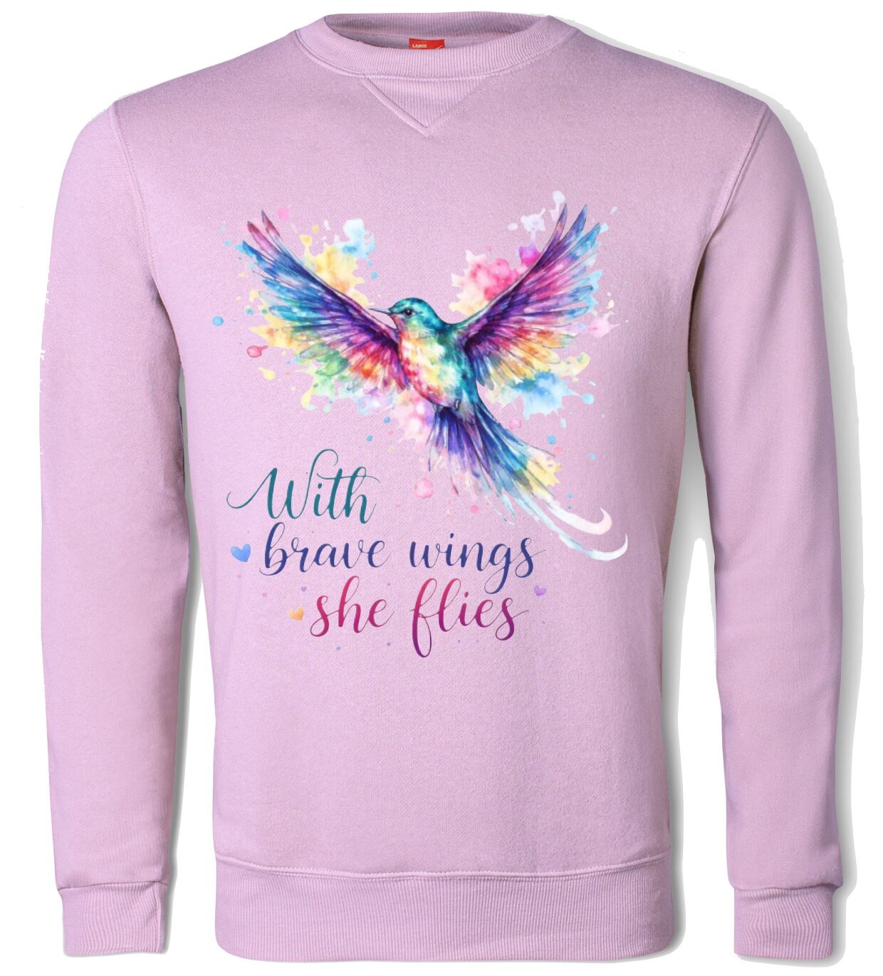 Lilac Sweater with With Brave Wings She Flies design printed on the front